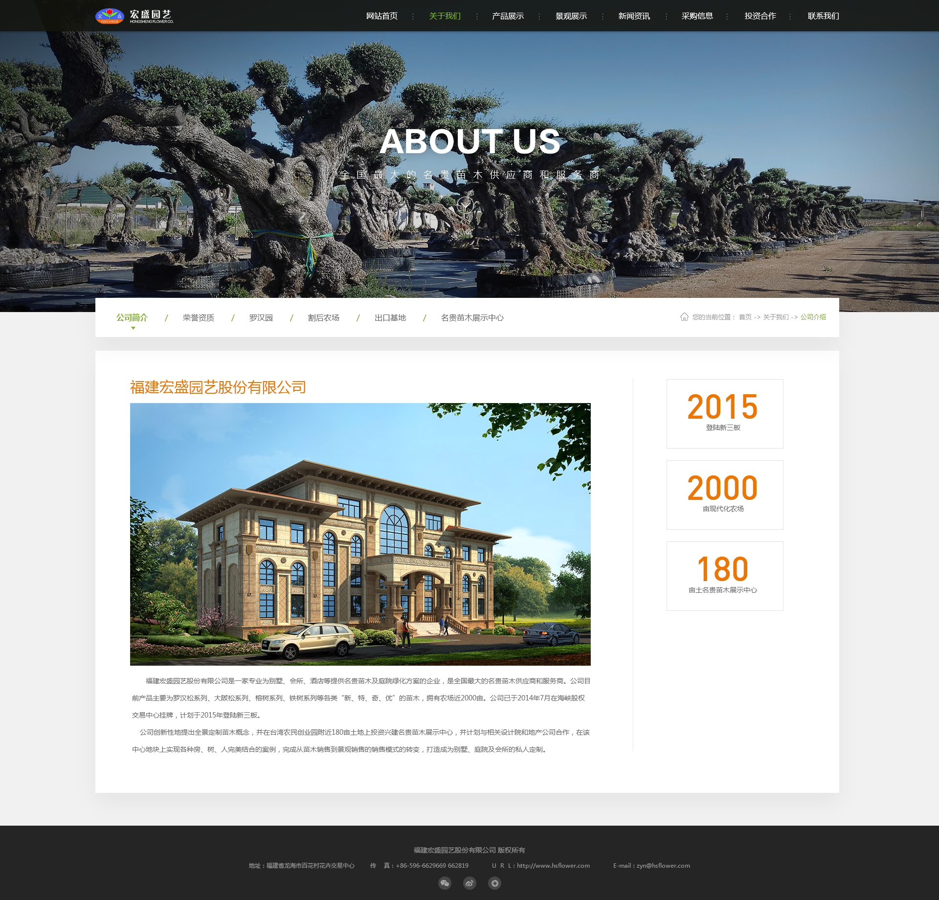 福建宏盛园艺股份有限公司 官网 福建宏盛园艺股份有限公司是一家专业为别墅、会所、酒店等提供名贵苗木及庭院绿化方案的企业,是全国最大的名贵苗木供应商和服务商。公司目前产品主要为罗汉松系列、大阪松系列、榕树系列、铁树系列等各类“新、特、奇、优”的苗木,拥有农场近2000亩。公司已于2014年7月在海峡股权交易中心挂牌,计划于2015年登陆新三板。